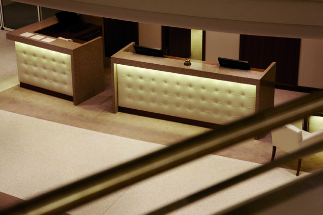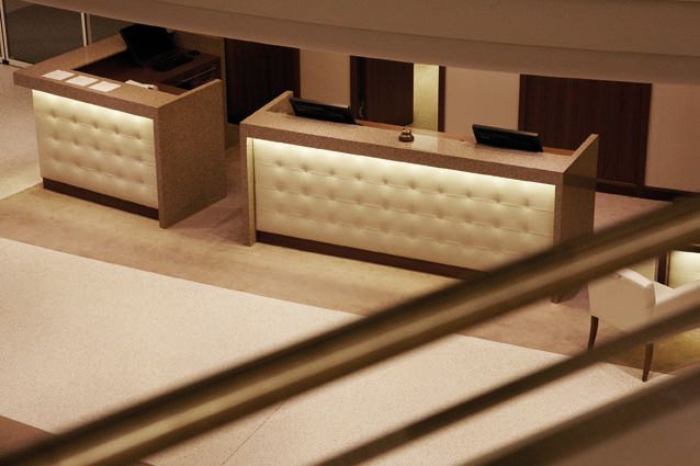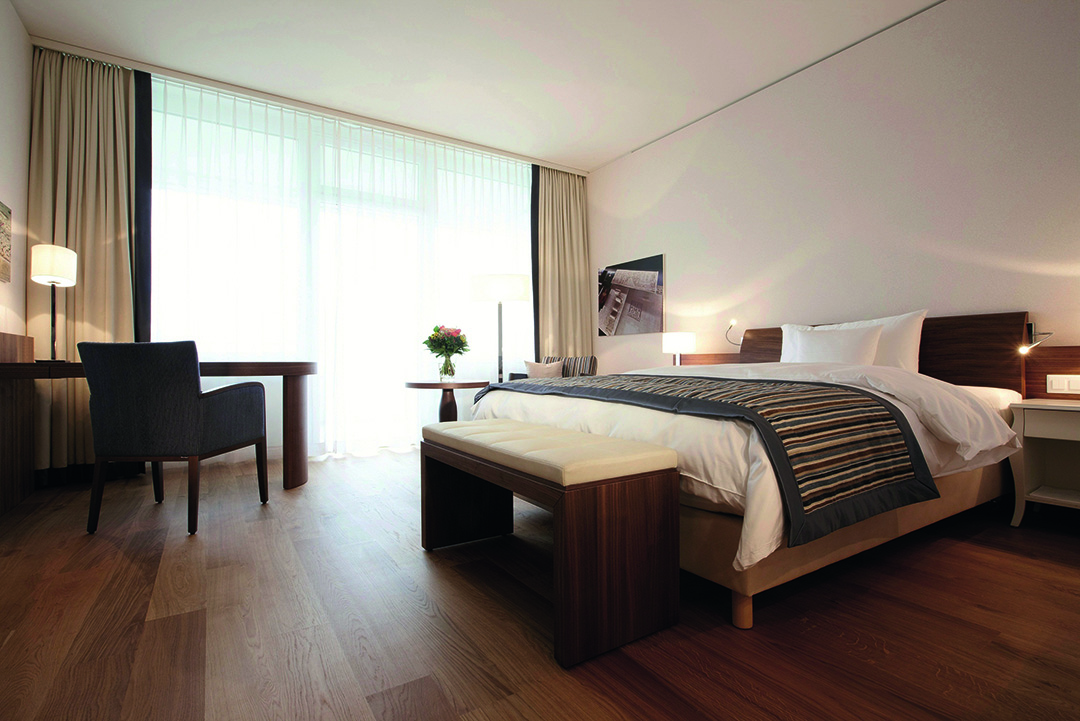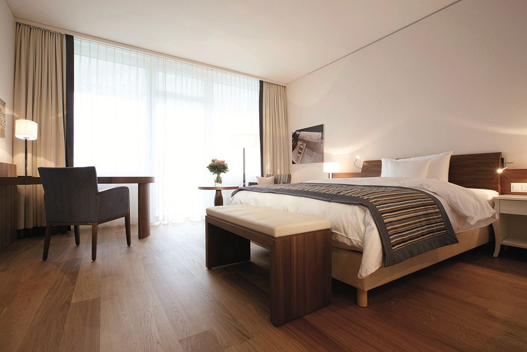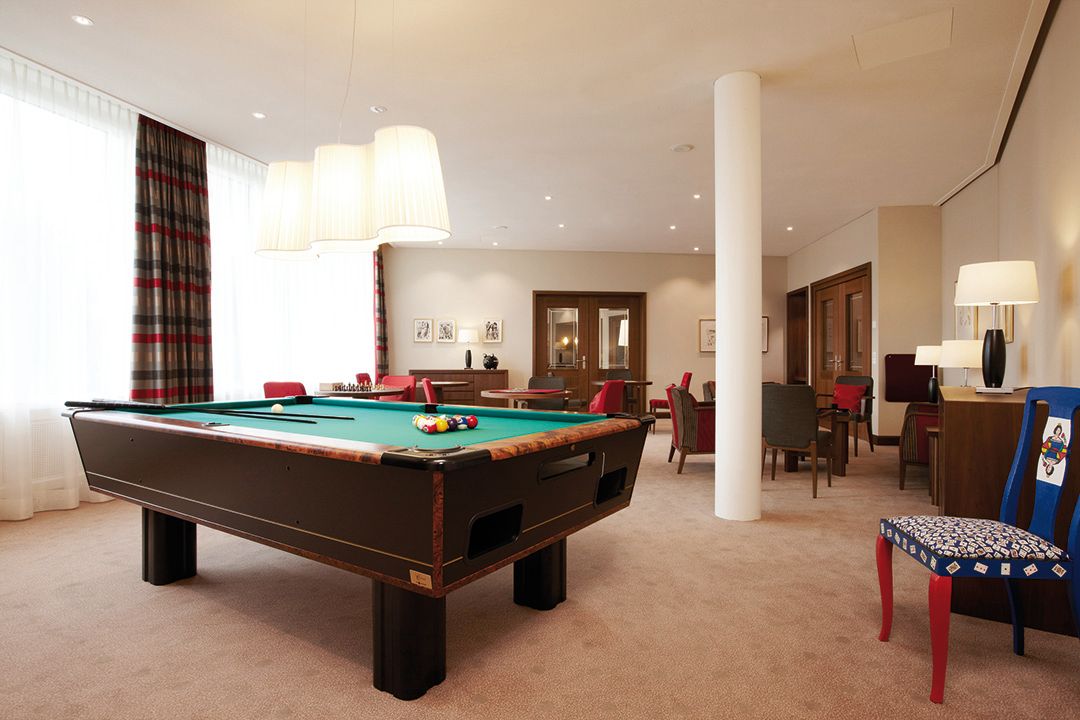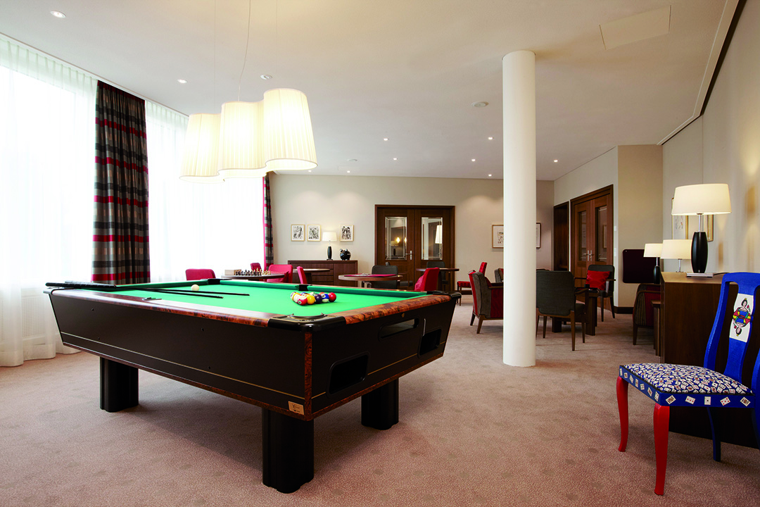 Eine gesunde Auszeit zum Wohlfühlen: Dafür müssen nicht nur die ärztliche Beratung, ein ausgewogenes kulinarisches Angebot sowie die Möglichkeit der Bewegung und Entspannung gegeben sein. Ein wesentlicher Faktor ist auch das Ambiente, das schon bei der Ankunft des Gastes stimmen muss: Deshalb gestalteten wir für das Kurhaus eine atemberaubende Empfangshalle, die sich vor allem durch sanft schlingende Formen und große, eigens für diesen Bereich entwickelte Leuchter auszeichnet. In der angrenzenden Bar und dem gemütlichen Kaminbereich kann der Gast dann gleich die gewonnenen Eindrücke in warmer Holzatmosphäre auf sich wirken lassen. Eine ähnliche Gestaltung aus edlem Nussbaum und hellem Eichenholz sorgt in der Smokerlounge mit speziell gefertigtem Humidor, dem Konferenzzimmer sowie dem Spielzimmer mit selbst produzierten Holzbrettspielen und Billardtisch für Unikatcharakter. Neben der Restaurantgestaltung waren wir zudem für die Holzausbauten des Spas verantwortlich. Dort und in den übrigen realisierten Bereichen war es für uns selbstverständlich, auch für die passenden Polsterungen, Stoffauskleidungen und Böden zu sorgen. So wurde aus unserer Rundum-Betreuung durch uns eine Rundum-Wohlfühl-Atmosphäre für tausende von zufriedenen Gästen.